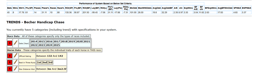 The Becher is a good race for trends analysis even if nothing is decisive. To cut the field down you could do worse than focus on horses who met the following criteria.
