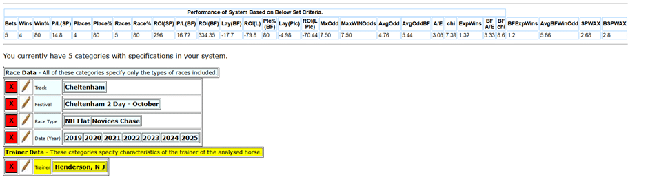 Digging further into horsercacebase – Nicky Henderson is 2-2 in novice chasers and 2-3 in NH flat races, all his five winners.