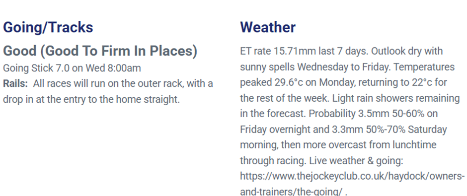Up at Haydock, the ground was described as Good, good to firm in places on Wednesday — with a similar forecast to Sandown. A couple of dry and sunny days are expected, so I wouldn’t be surprised to see some watering.