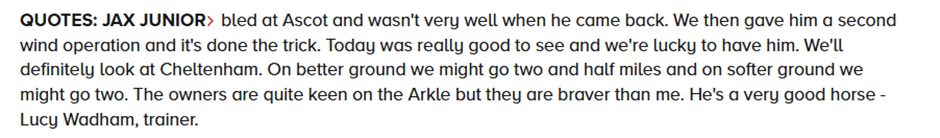 Elsewhere on the Sandown card, Jax Junior returned to winning ways in the Virgin Bet Every Saturday Money Back Handicap Chase (1m7½f). Trainer Lucy Wadham told the Racing Post the owners are keen on an Arkle tilt.