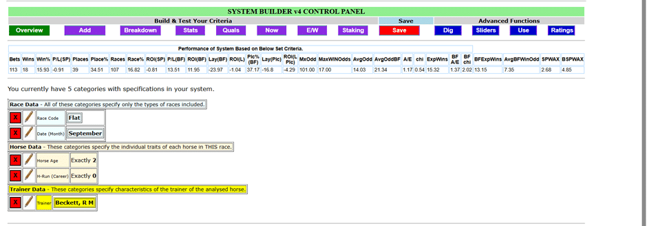 A near 16%-win strike rate overall for the Beckett juvenile debutants on turf in September is decent. However, you can improve on that if you concentrate on certain tracks and I was right about Salisbury. Beckett has had 6 winners from 29 runners 21% +9.8 with newcomers at Salisbury. He does even better at three other tracks: Haydock, Chepstow and Ffos Las.